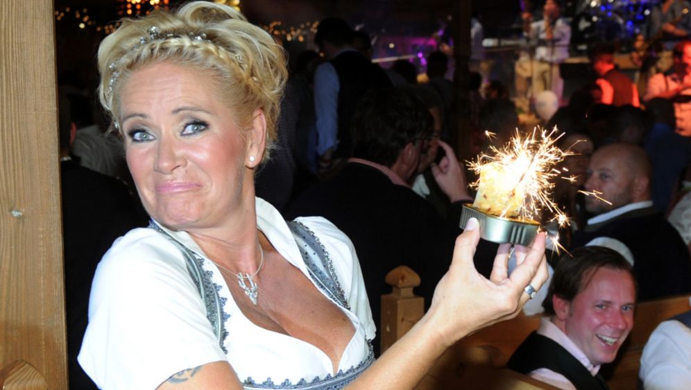 Claudia effenberg feiert mit tracht und torte.